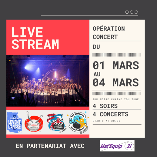 Chaque soir à partir de 20h30, un concert d’environ 2h regroupant chant, danse, musique et sketchs vous attendra gratuitement en streaming live sur leur chaîne YouTube