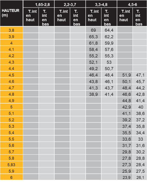 A noter : la capacité de charge diffère selon si la tube est positionné vers le haut ou vers le bas.