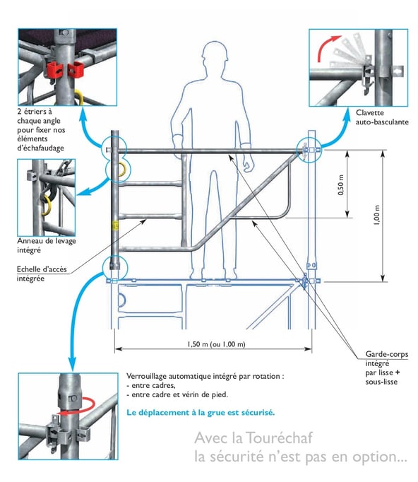 Le cadre intègre tous les éléments de sécurité : lisse, sous-lisse, échelle d'accès, verrouillage automatique et anneau de levage pour sécuriser les déplacements à la grue. Poids du cadre 12.40kg